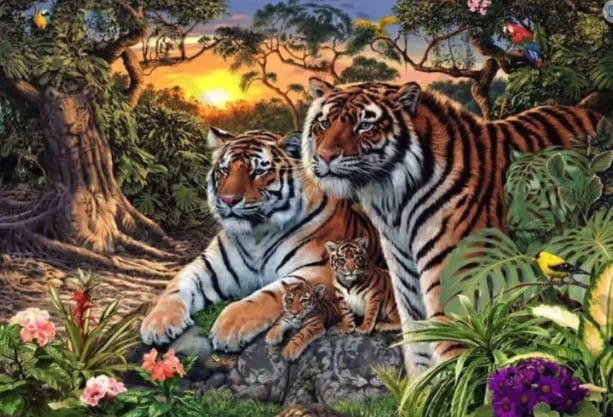 At first glance, it looks like a calm jungle scene with a few tigers relaxing in the greenery. But the real number hidden inside is said to be 16 tigers.