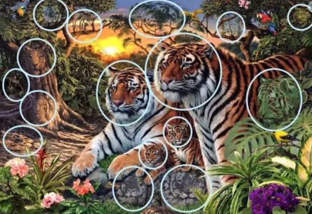 Just like the dolphin puzzle, some are obvious—others are disguised by foliage patterns, shadows, or blended into other tiger shapes. These are the ones that mess with you, because your brain registers “jungle texture” and stops searching.