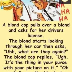 A blonde cop pulls over a blonde driver and asks for her driver’s license. The driver searches through her car and asks, “Uhh, what are they again?”…